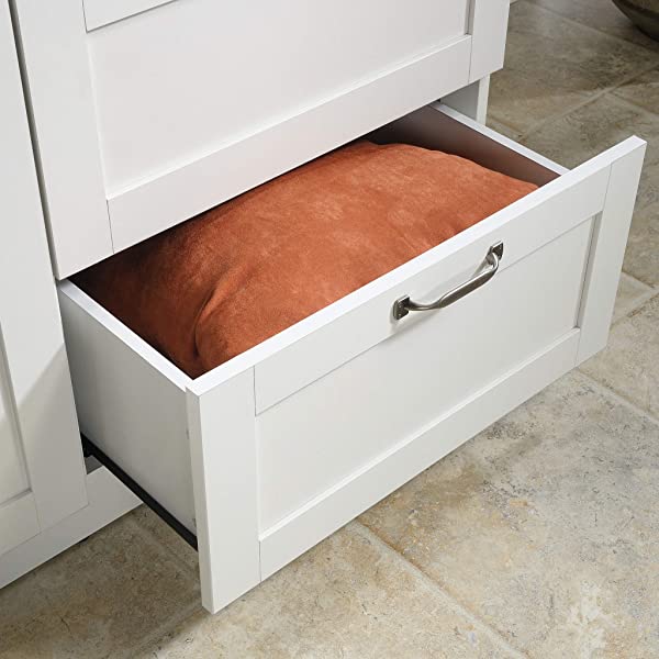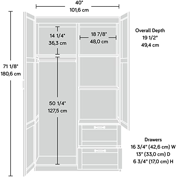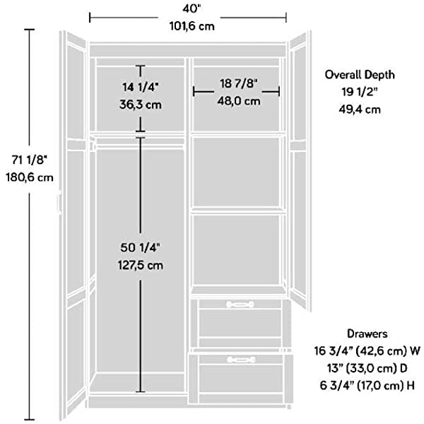 5 year limited warranty. Assembled dimensions: L: 40. 00" x W: 19. 45" x H: 71. 10". Engineered wood construction. Cinnamon Cherry finish. This wardrobe meets ASTM International's industry standard ASTM F2057-19 Safety Specification for Clothing Storage Units, which is intended to reduce hazards to children 5 and under due to tip-over of furniture. Two drawers with metal runners and safety stops. One fixed and one adjustable shelf behind upper door. Storage behind full length door includes garment rod and fixed shelf. Safety tested for stability to help reduce tip-over accidents. Imported. Item Does Not Contain Fabric. Color:Cinnamon Cherry| Pattern Name:Cabinet Need a place to store your abundance of stuff? Check out this storage cabinet from Sauder Select collection. It features a garment rod and fixed shelf behind the full length door, one fixed and one adjustable shelf behind the upper door, and two easy-to-access sliding drawers. Finished in a dark Cinnamon Cherry and detailed with frame and panel doors and sides, this piece is the perfect storage solution for you.