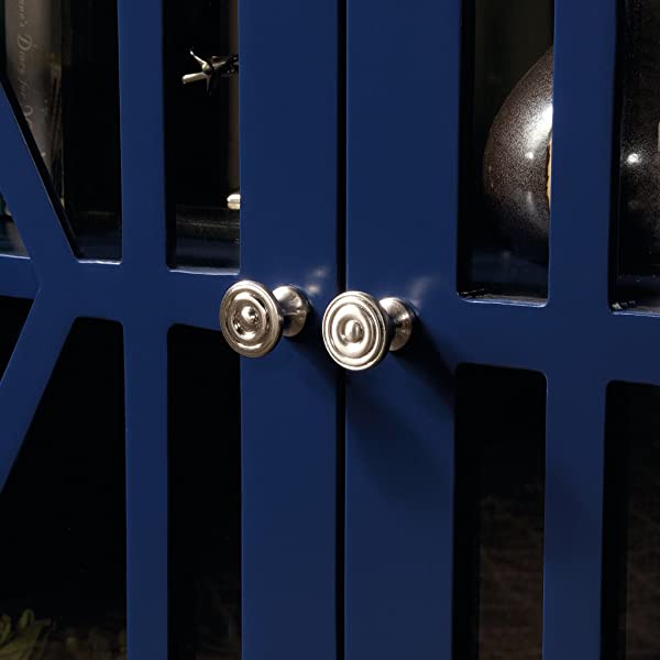 Assembly required. 1 year limited. Assembled dimensions: L: 35. 98" X W: 15. 75" X H: 35. 95". Engineered wood and glass construction. Indigo Blue finish. Permanent Shelf. Framed, safety-tempered Glass doors feature geometric, cut-out design. Color:Indigo Blue Finish Craving some unique style for your home? You are in luck! This display cabinet from the Shoal Creek collection offers elegant design and functionality to make this the perfect statement piece for your home. Its framed, safety-tempered glass doors feature a geometric, cut out design that gives this piece its one-of-a-kind look that is sure to catch the attention of all your guests. Behind its double doors is a storage area that includes a large shelf that is perfect for storing and displaying anything from your abundance of cook books and organizing bins to prized possessions and decorative knick-knacks. Its spacious top surface also makes an ideal spot for an accent lamp, plants, and photos of the family. This versatile cabinet adds charm and functionality no matter where it stands – in the entryway, down the hallway, or as an accent piece in the living room. Finished in Indigo Blue, this beautiful cabinet will give your home a fresh new look.