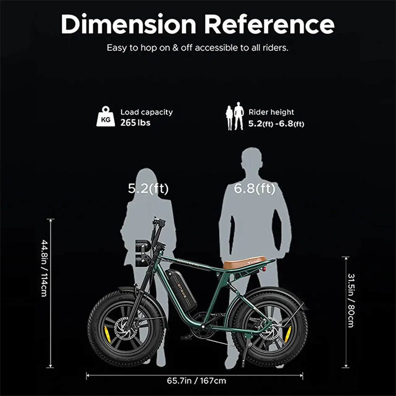 【Best Retro Motorcycle-Style Ebike Under $3000】The Ebike is a retro light-duty electric off-road bike,based on the appearance and function of traditional off-road motorcycle redesigned, it has different highlights from other electric bikes. Smooth body lines de 【Upgraded 1000W Brushless Hub Motor and 7-Speed Gear System】 The 1000W peak brushless hub motor offers enhanced climbing ability, reaching speeds of up to 28 mph and 55N.m torque in pure electric mode, effortlessly conquering gradients of up to 35 degrees. The 7-speed gear system caters to all your riding and training needs. Additionally, it features brighter LED headlights and taillights to keep you visible and safe during nighttime rides. 【Extended Range up to 94 Miles with 48V 26A Dual Battery】 The dual-battery version offers a maximum range of up to 94 miles. In pure electric mode, travel up to 34.17 miles, or switch to assist mode for up to 47 miles. For the ultimate long-range experience, achieve up to 68 miles on a single charge, perfect for long rides on your cruiser or mountain ebike. 【All-Terrain Capability with 4.0*20 Inch Fat Tires & Full Suspension】 Equipped with 2 front fork spring shock absorbers, 2 seat shock absorber springs, and 2 puncture-resistant 20"X4" fat tires, providing outstanding shock absorption performance. Combined with front and rear mechanical disc brakes and the EABS system, you can enjoy a comfortable riding experience and powerful braking even on steep slopes, rugged terrain, or other extreme terrains. 【Safe and Quiet Ride with Dual LED Headlights & 30db Low Noise Level】 Ride confidently with dual headlights and taillights for enhanced visibility. Front and rear disc mechanical brakes offer smooth stopping power. The low noise level of just 30db ensures a quiet and peaceful journey. 【Certified and Reliable with UL Certification & Comprehensive After-Sale Service】 The UL certified ENGWE M20 comes 90% pre-assembled and includes a one-year warranty on motors, batteries, and controllers.