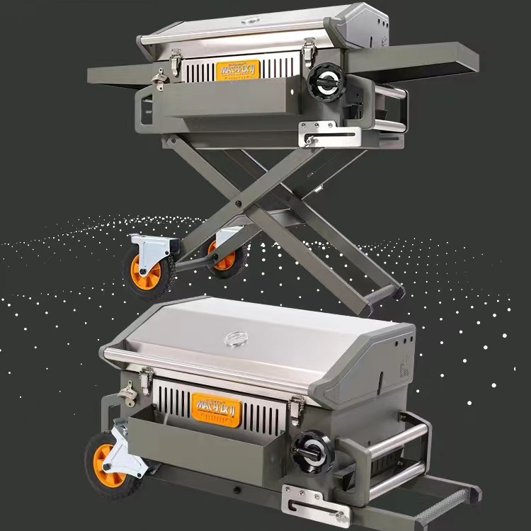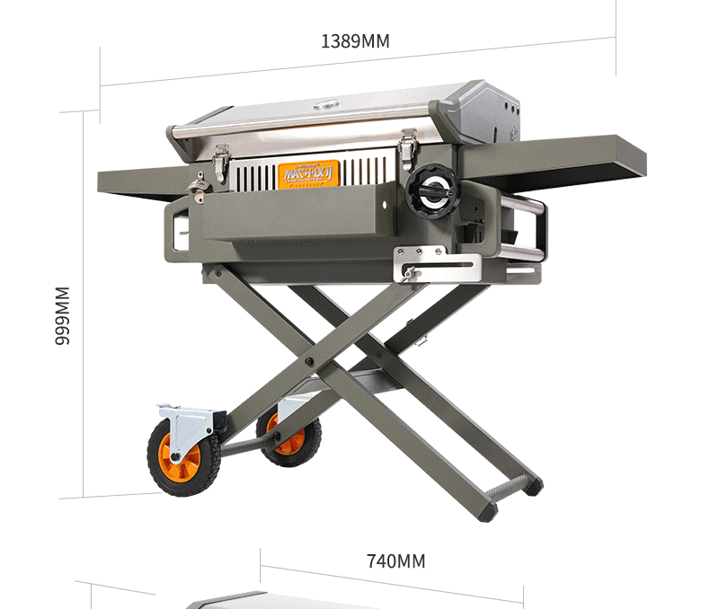 The folding, two wheel design makes it ideal for grilling-on-the-go and can be easily stored when not in use. The spring-assisted stand allows for effortless set up.