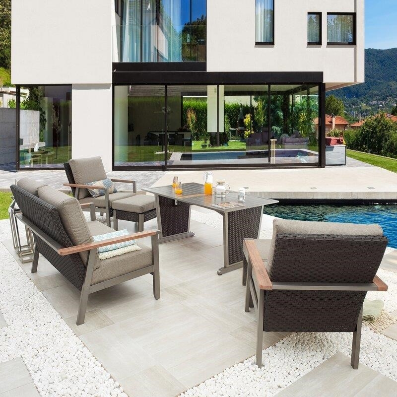 - Pieces Included: 1 dining table, 1 loveseat, 2 single chairs, 2 ottomans