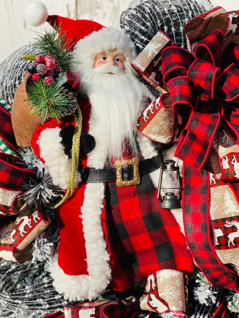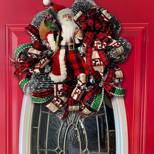 Materials: High Quality Ribbons, Ribbon Tails, Evergreen Pine Wreath, Greenery, Santa Attachment, 3 Hand made Bows