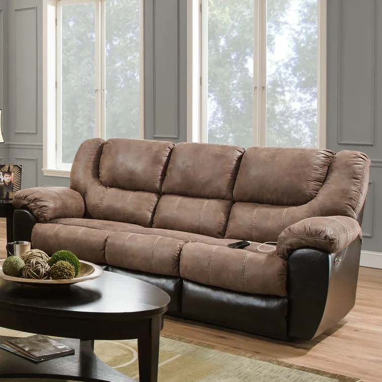 This reclining sofa brings versatile seating to your living space. Made in the USA from metal and a blend of solid and engineered wood, it stands on a plastic base in a black finish. This couch features three reclining seats with split backs and pop-out footrests, each one controlled manually with included levers. Wrapped in 100% polyester upholstery, its foam- and synthetic fiber-filled cushions support you as you sit up or lay down. This sofa's high backs and pillow-top arms create an inviting look. Best of all, no assembly is required: All you need to do is relax.