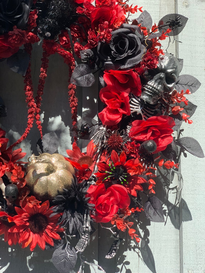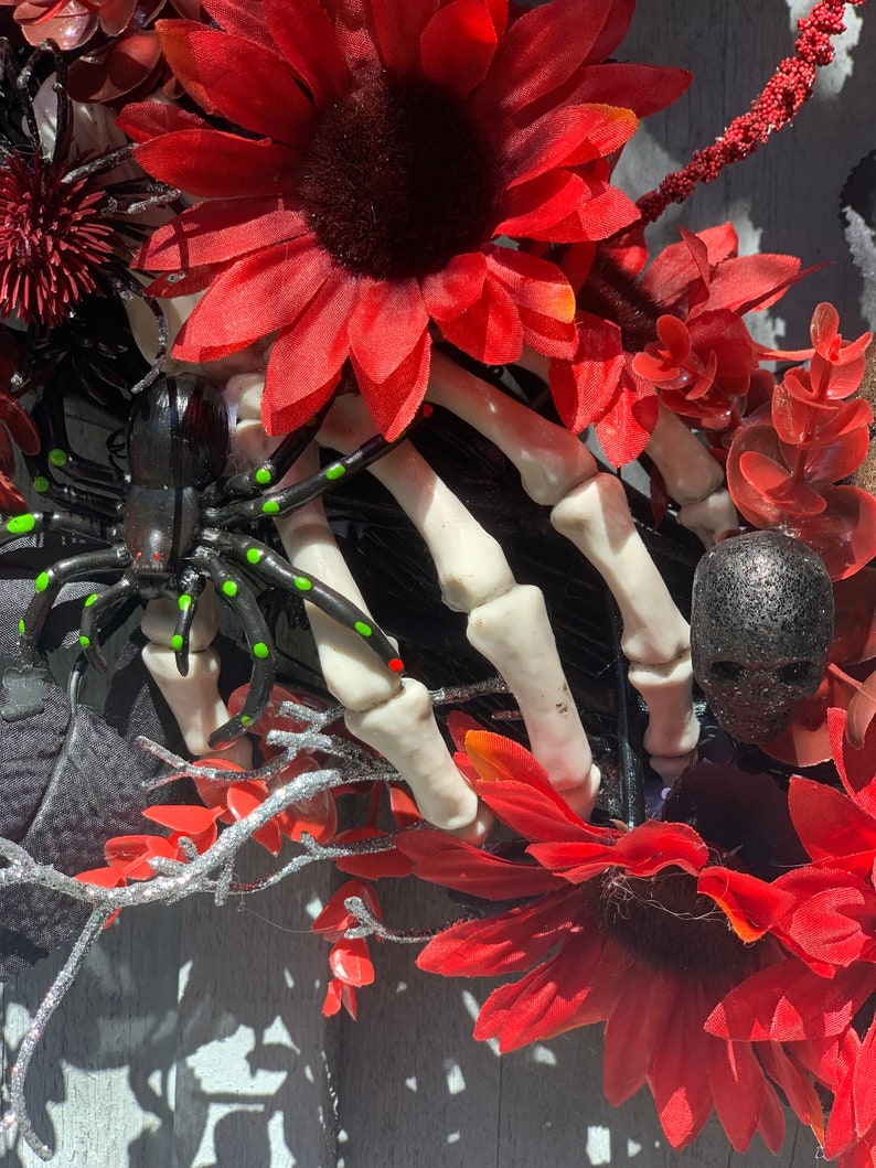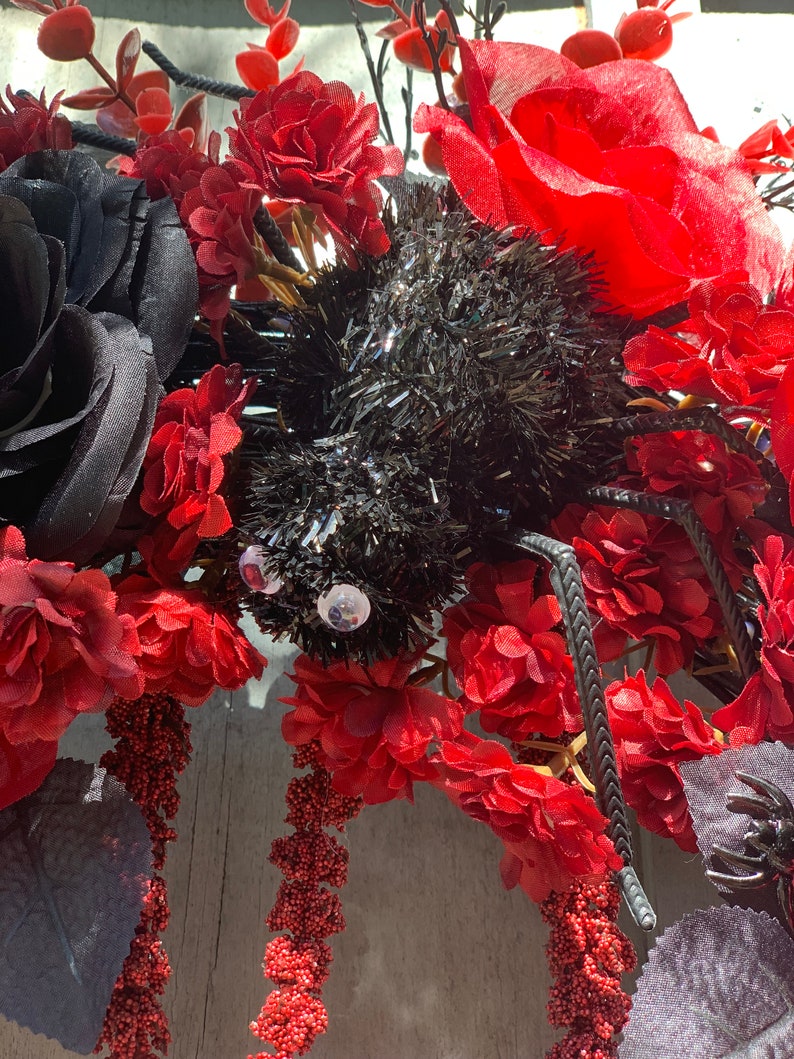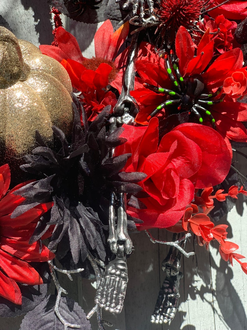 This wreath features a large Black Spider and Skeleton that are surrounded by 2 Skeleton hands, many various sizes of black spiders, a black and silver glitter gothic pumpkin, black skeleton heads, red roses, black roses, Red Mums, red thistle, red hanging amaranthus, red eucalyptus, Silver Glitter branches, black branch twigs, and black leaves.