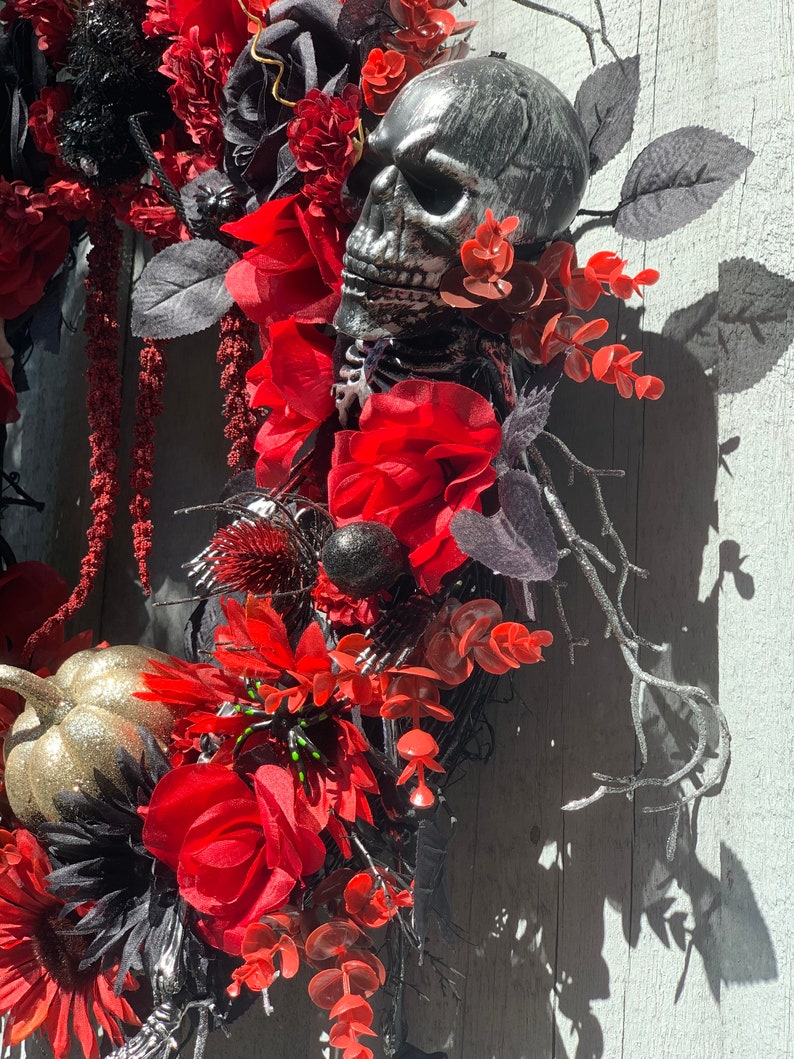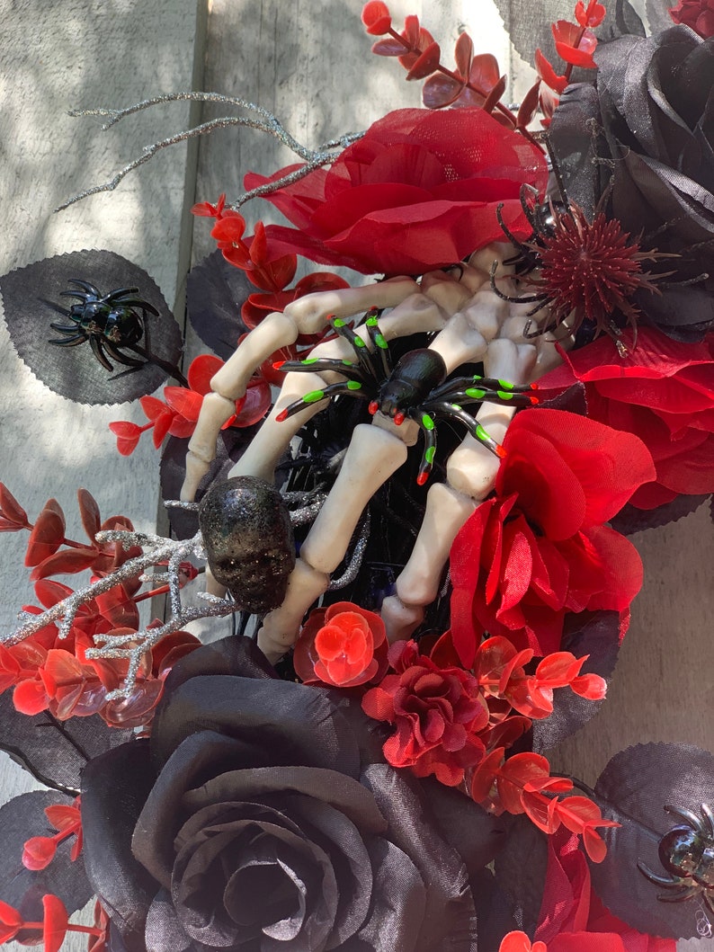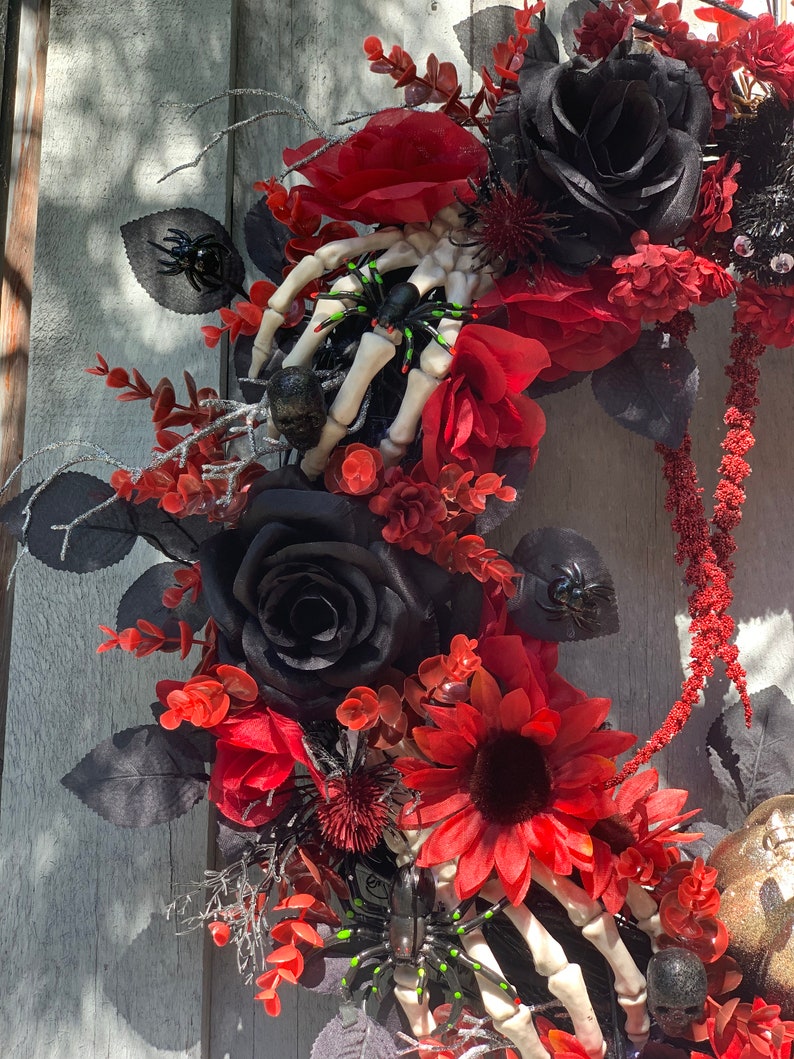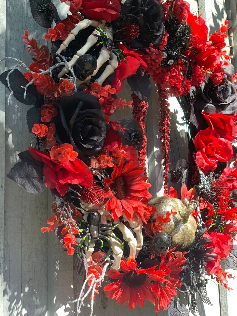 This wreath features a large Black Spider and Skeleton that are surrounded by 2 Skeleton hands, many various sizes of black spiders, a black and silver glitter gothic pumpkin, black skeleton heads, red roses, black roses, Red Mums, red thistle, red hanging amaranthus, red eucalyptus, Silver Glitter branches, black branch twigs, and black leaves.