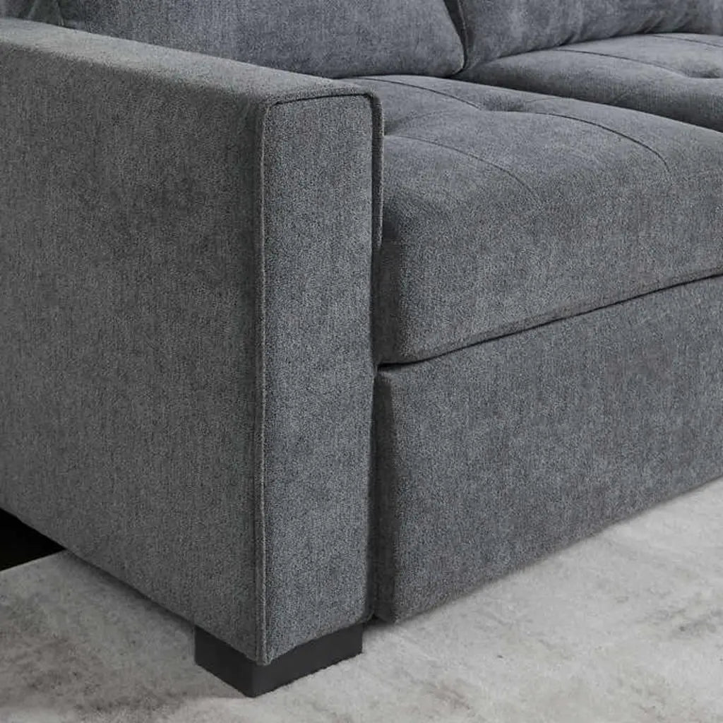 The Kendale Fabric Sofa Chaise was designed with today’s consumer in mind, offering comfort and function in addition to style. The high-density foam cushions offer a comfortable seat, while drop-in pocket coils and sinuous springs prevent sagging. Easily accommodate guests with a pull-out bed and storage compartment for blankets and pillows. The storage and bed pulls can be easily tucked under the cushions when not in use. Kendale is upholstered in ATHENA™ performance fabric, that is stain-resistant, water repellent and easy to clean. While durable, the gray fabric is also soft to touch. Sleek track arms and solid wood block feet give Kendale a contemporary feel, while flange welt trim, button less tufting, and box edge cushions offer a tailored look.
