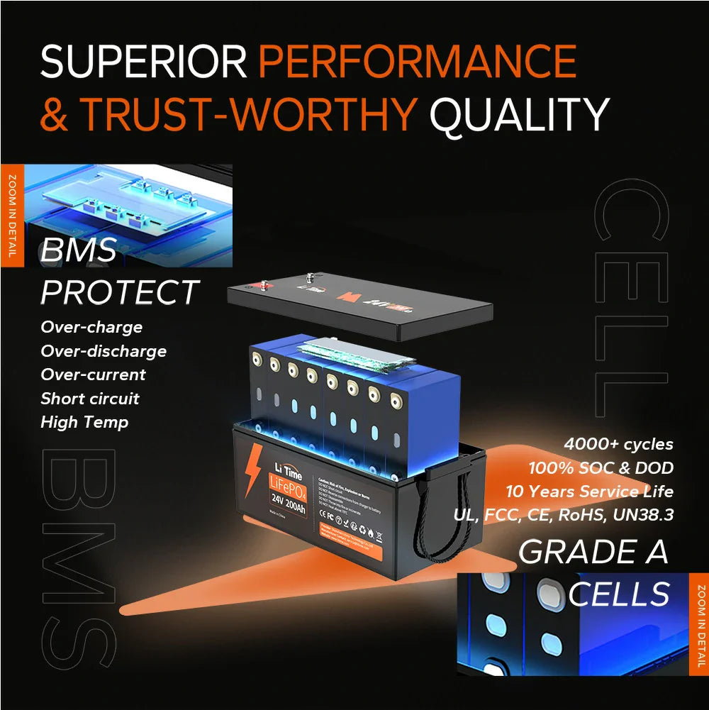 【Safe & Reliable Lithium Battery】 LiTime 24V 200Ah LiFePO4 batteries have exceptional quality since they are assembled by Automotive LiFePO4 Cells with UL certificated, which have a higher energy density, more stable performance, greater power, and excellent 3% self-discharge rate.