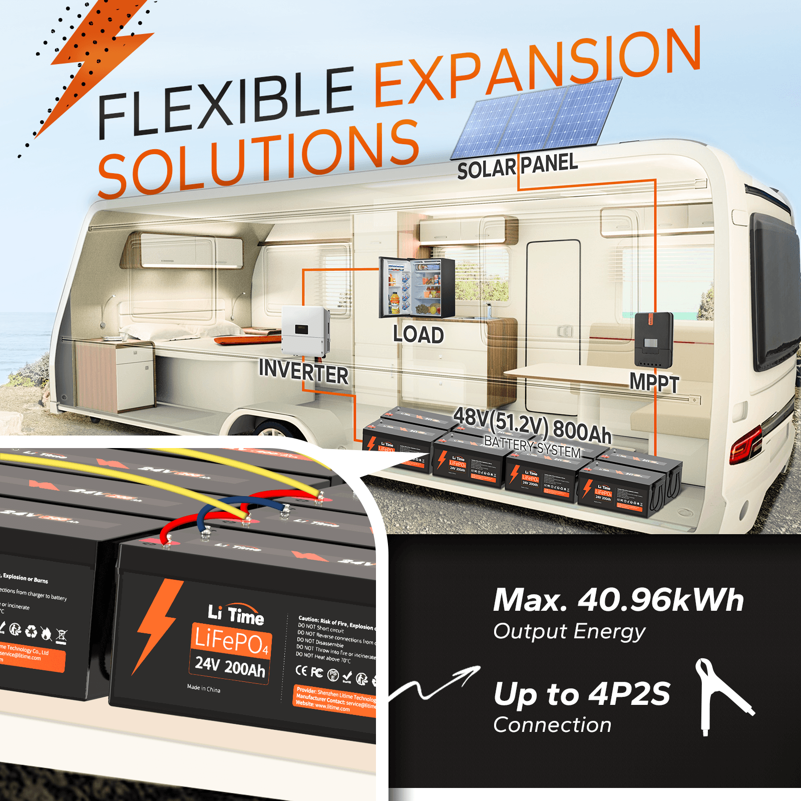 【5120Wh Higher Energy】 24V 200Ah lithium battery equals two 24V 100Ah lithium batteries. It is allowed to be expanded to a max 2S4P as 51.2V 800Ah battery system with around 41kWh energy. Perfect for which requires higher power or longer battery runtime Applications.