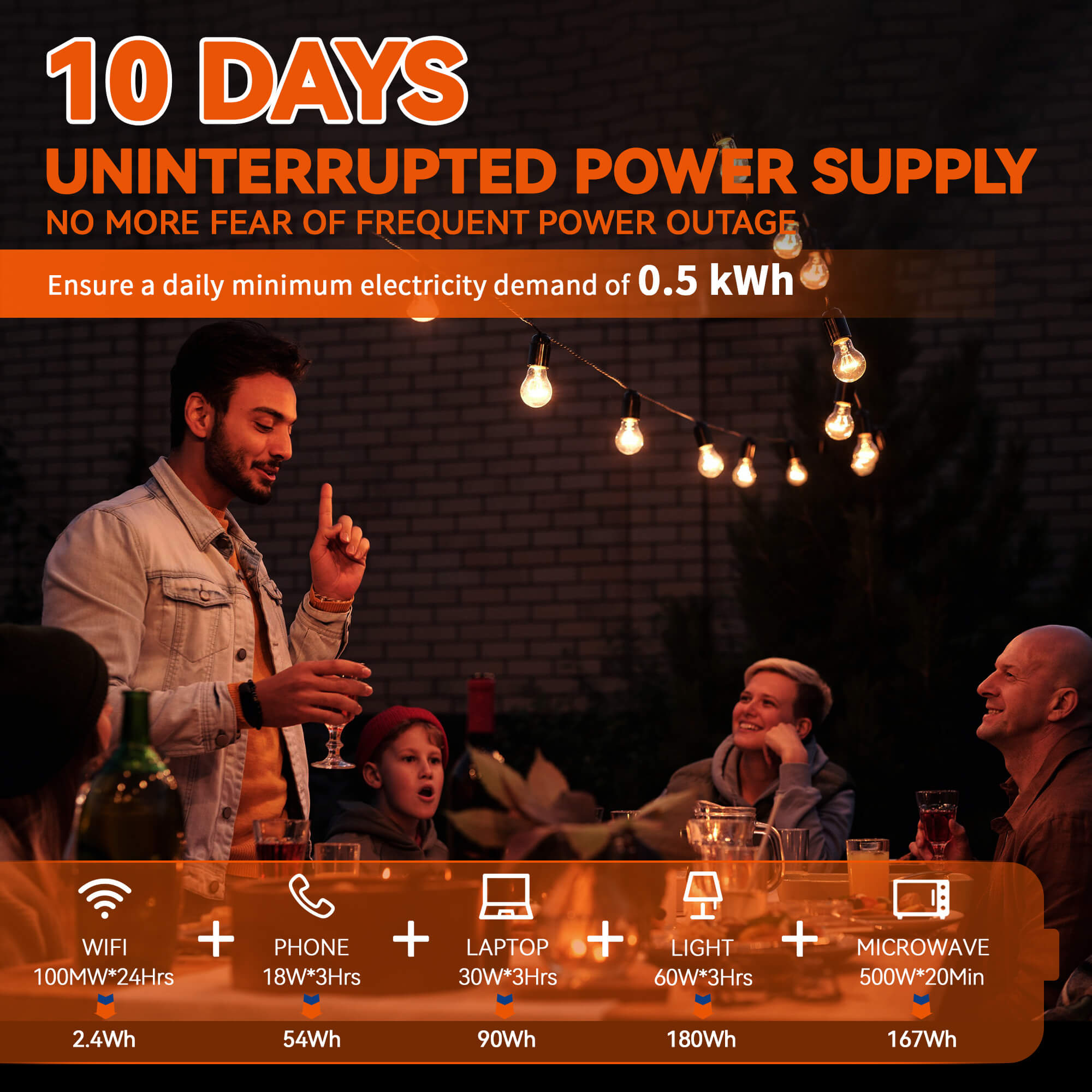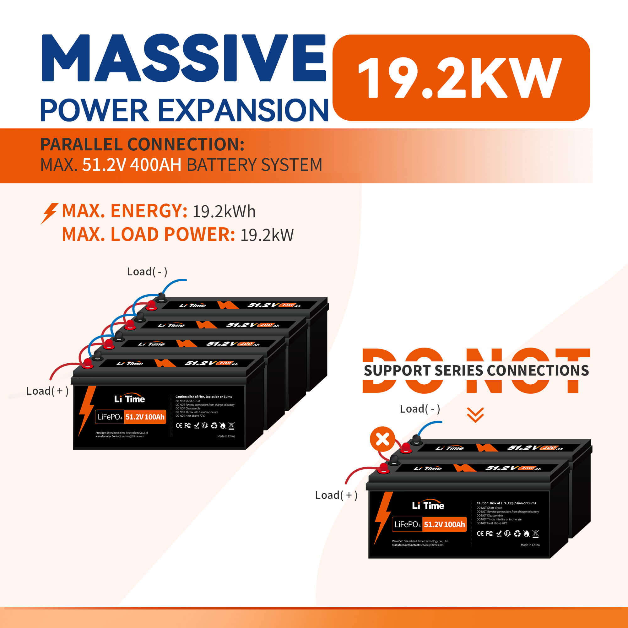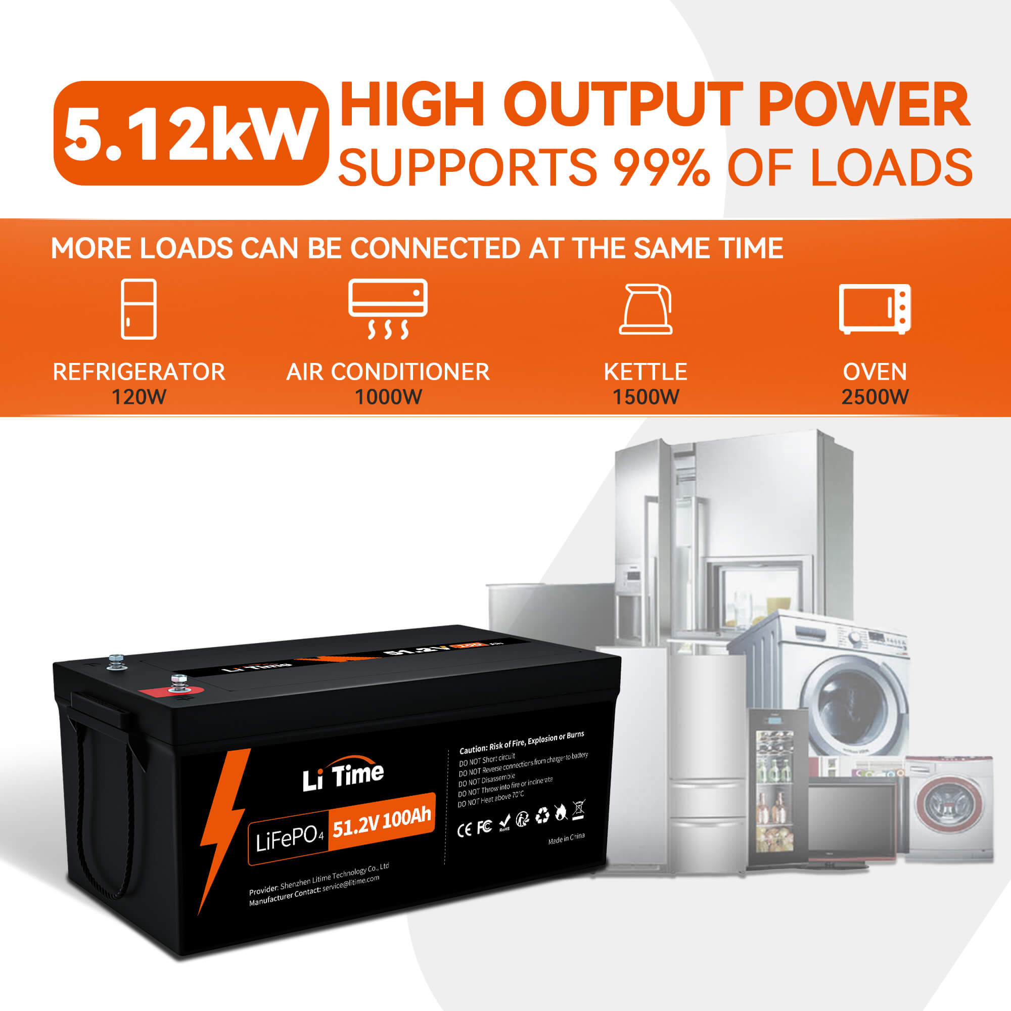【10 Days Nonstop Power Supply】With LiTime 51.2V 100Ah lithium batteries, you can enjoy up to 10 days of uninterrupted power for your home (assuming a minimum daily usage of 0.5kWh) and avoid any grid outages. With 100A BMS and 5120W output, you can even power heavy-duty appliances such as air conditioners and dryers at the same time. Plus, you can connect them in parallel to increase power output (max. 4P for 20.48kW).