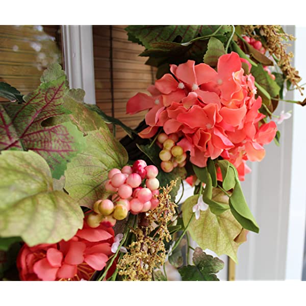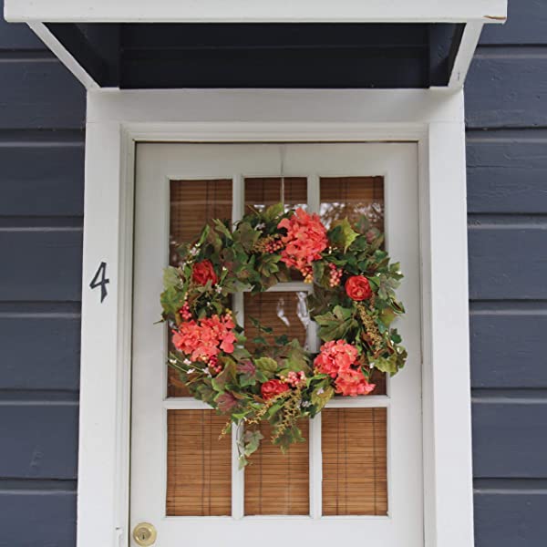 APPROVED FOR COVERED OUTDOOR DISPLAY - For best longevity, keep out of direct sunlight and rain. Prolonged intense sunlight can cause silk flowers to fade. DESIGNED IN USA WITH CARE- Wreath Depot floral designers choose their arrangements with care unlike others. BEAUTIFUL WHITE GIFT BOX- Includes a Wreath Depot white storage gift box. THIS HANDCRAFTED WREATH ACTUALLY MEASURES TRUE TO SIZE- Measures 22-24 inches across and 5-7 inches deep. The wreath size does not dissapoint like others. FULL SPRING WREATH WILL SPRUCE UP YOUR FRONT DOOR- Faux coral colored geranium heads, pink flower blooms, abundant silk foliage, wispy blossoms, and berry clusters. Handcrafted on a sturdy, durable grapevine wreath base. Makes a great Spring Wreath,and Easter Wreath with the lively colors.