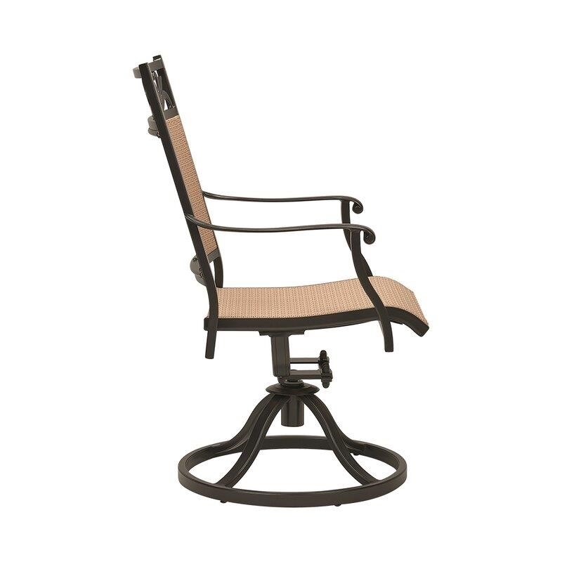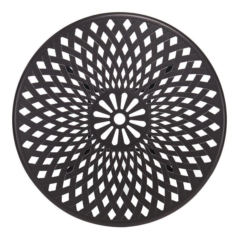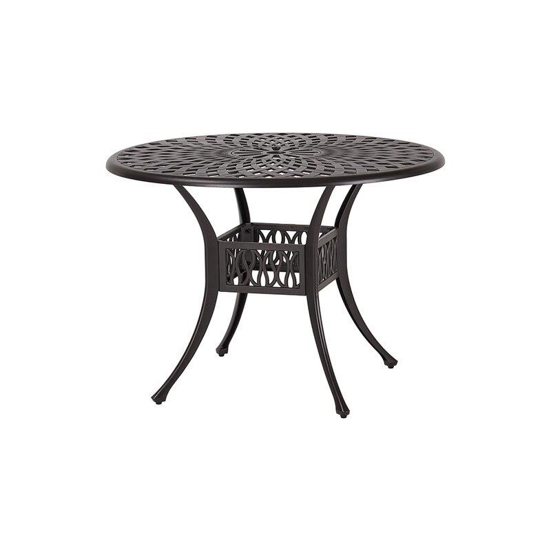 Add motion to your outdoor living space with the round dark brown cast aluminum patio dining set. It is made from premium cast aluminum with a dark brown powder-coat finish that's designed to be rust-resistant and weather resistant. This set is durable heavy-duty cast aluminum dining chairs with arms and a round dining table. The decorative outdoor dining table comes with an umbrella hole in the center of the table as well as anti-slip rubber tips on each table leg. A matching table skirt around the bottom gives more stability and design. Each dining chair also comes with anti-slip rubber tips on base too.Product Details