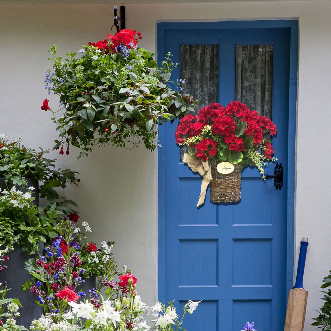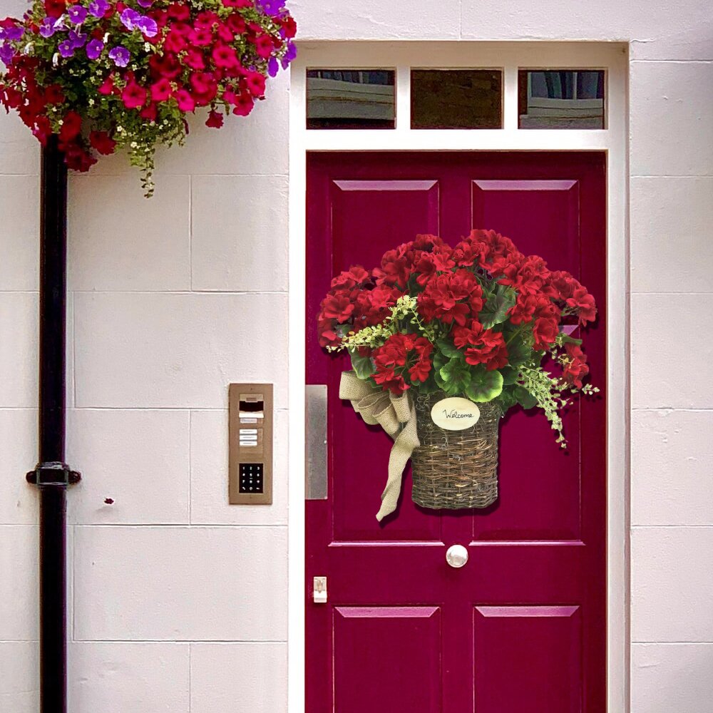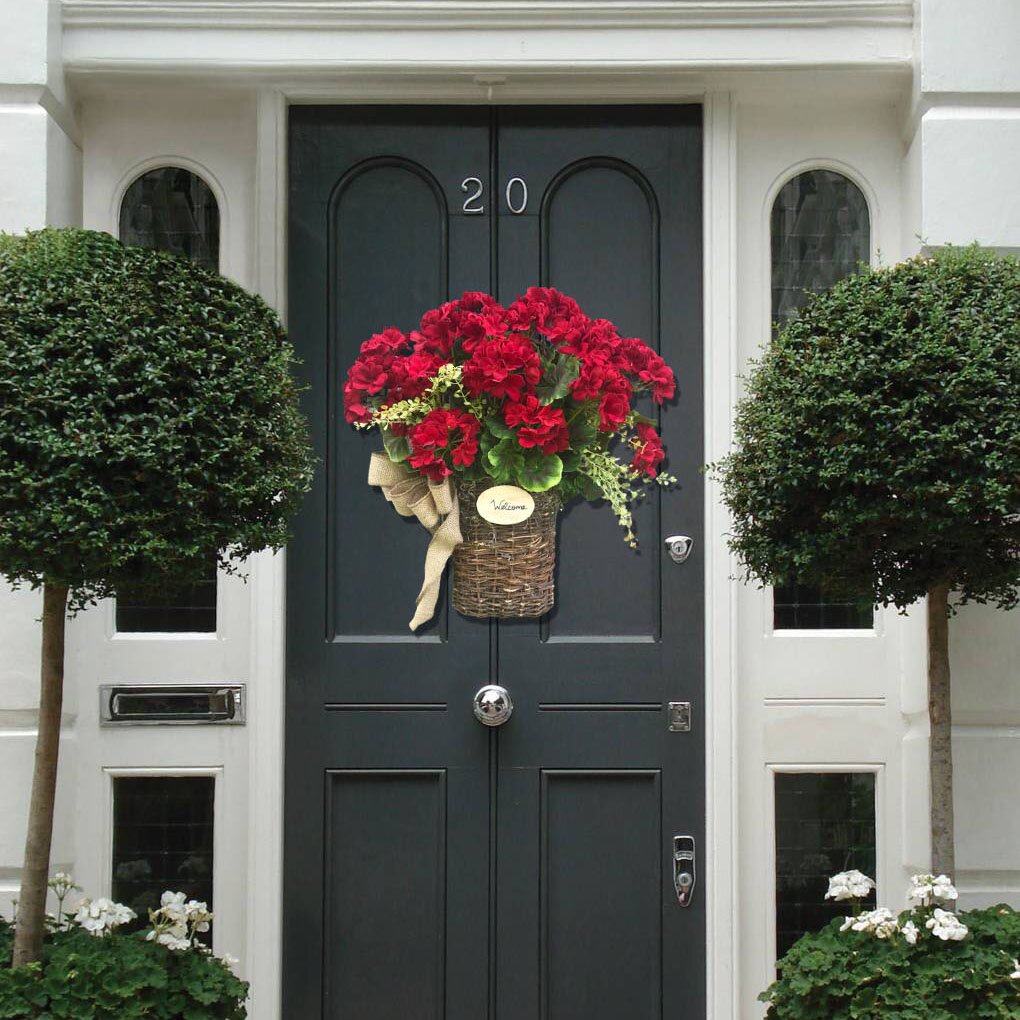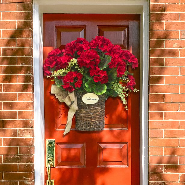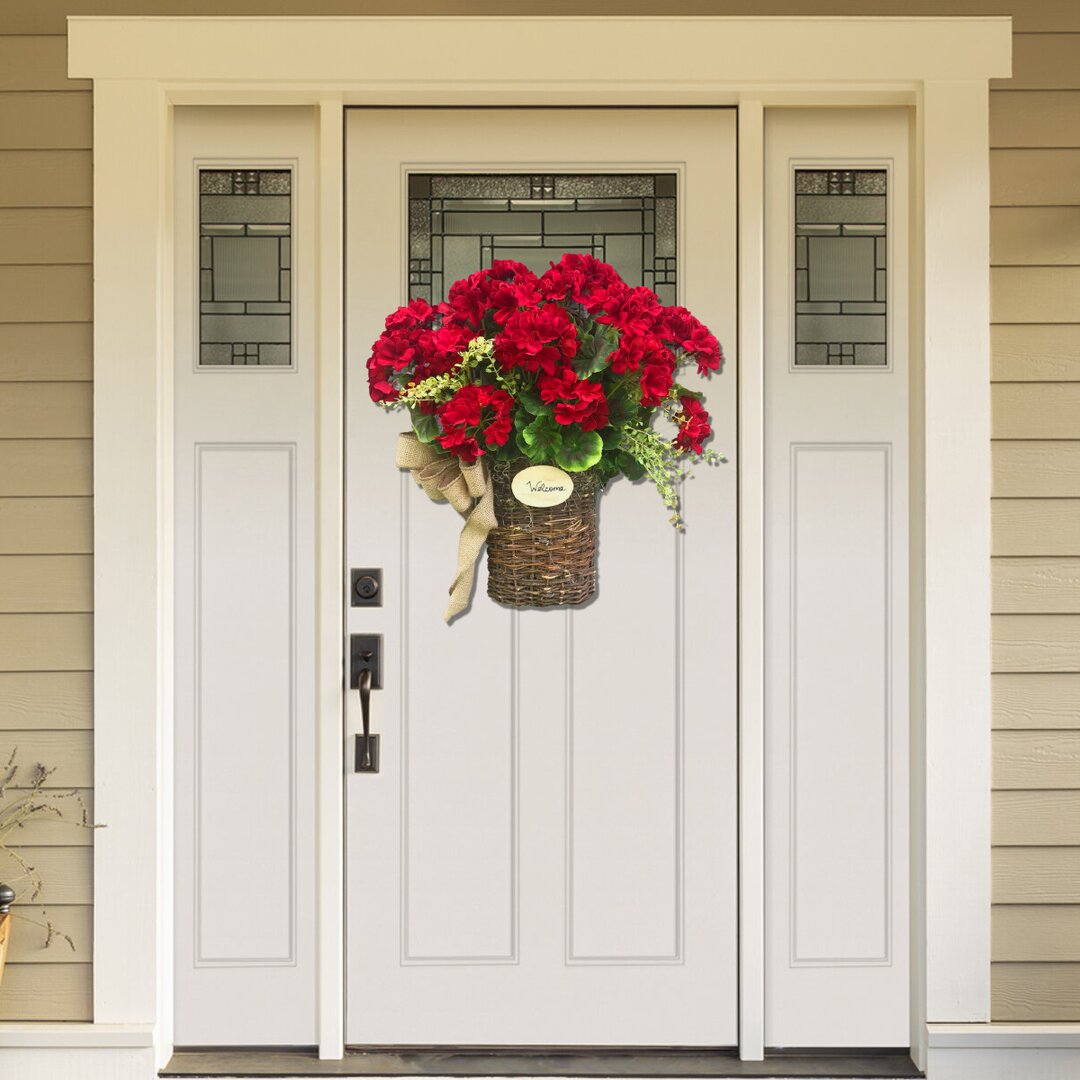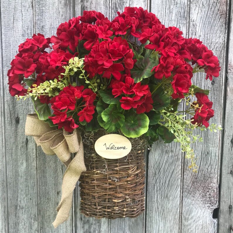 This is a new Summer Creation! Geraniums to me always symbolize SUMMER. If you are looking for a great piece for your door or deck for summer, you have found it. This basket is filled with beautiful rich red geraniums, and a adorable handmade Welcome Sign.