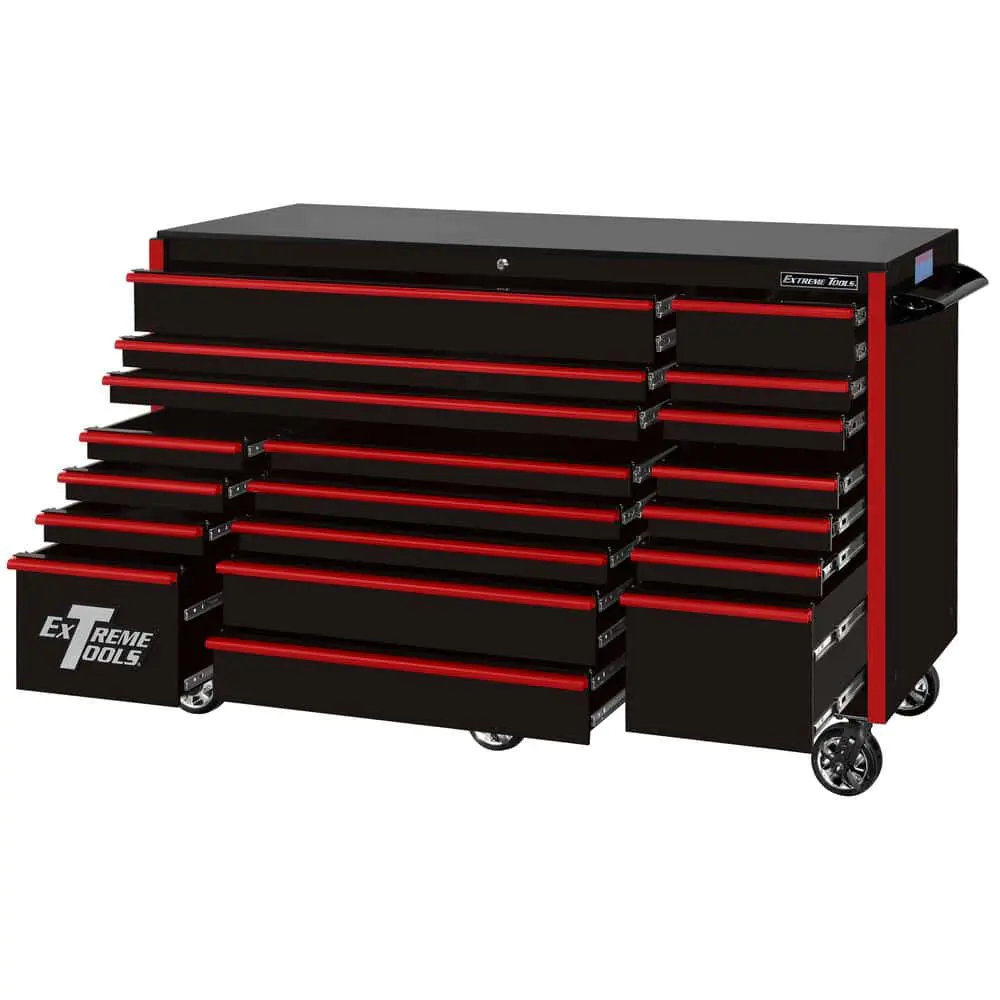 EXTREME TOOLS 72" RX Series 19 Drawer 30" Deep Roller Cabinet with Bins - Black with Red Drawer Pulls